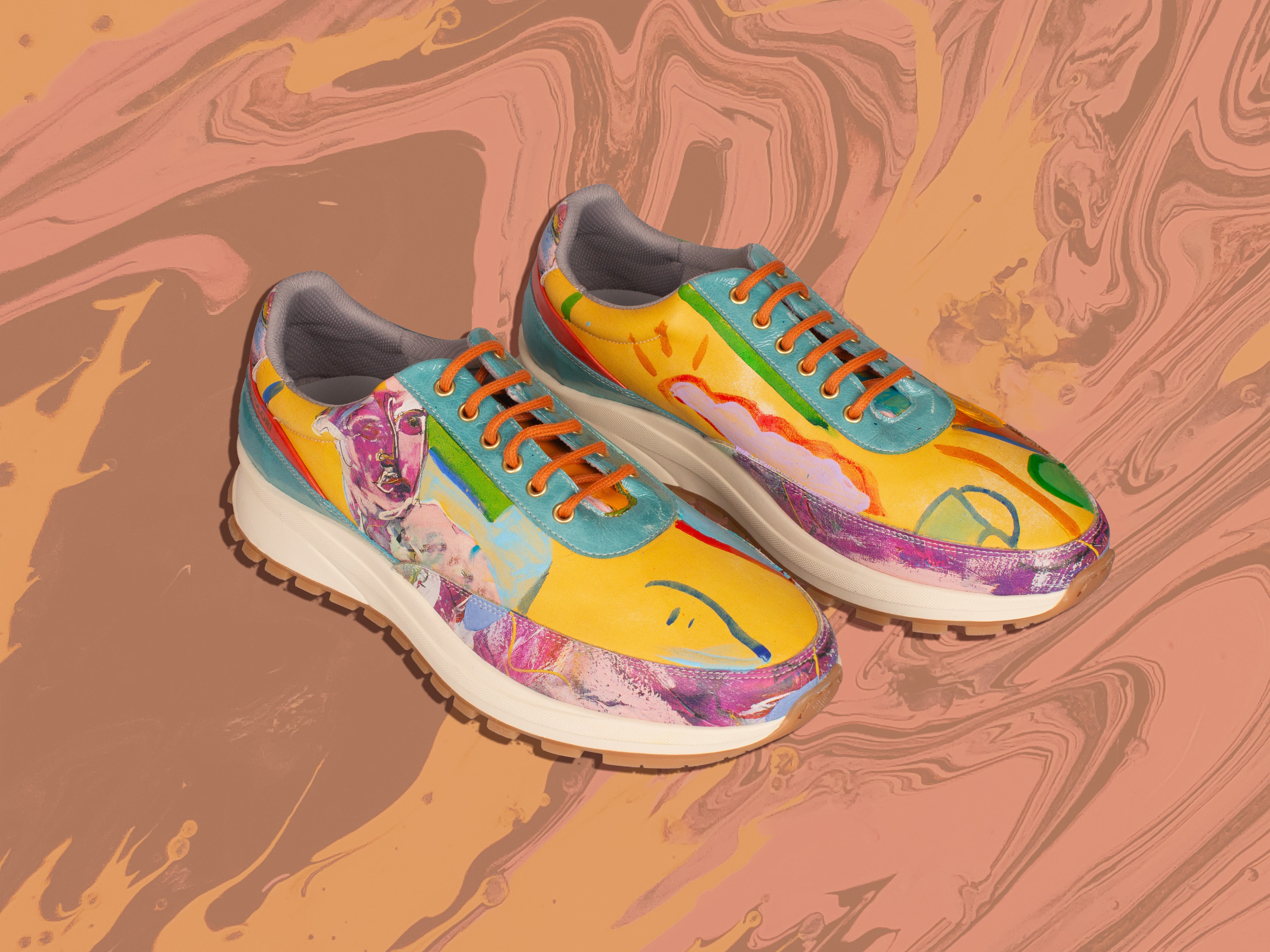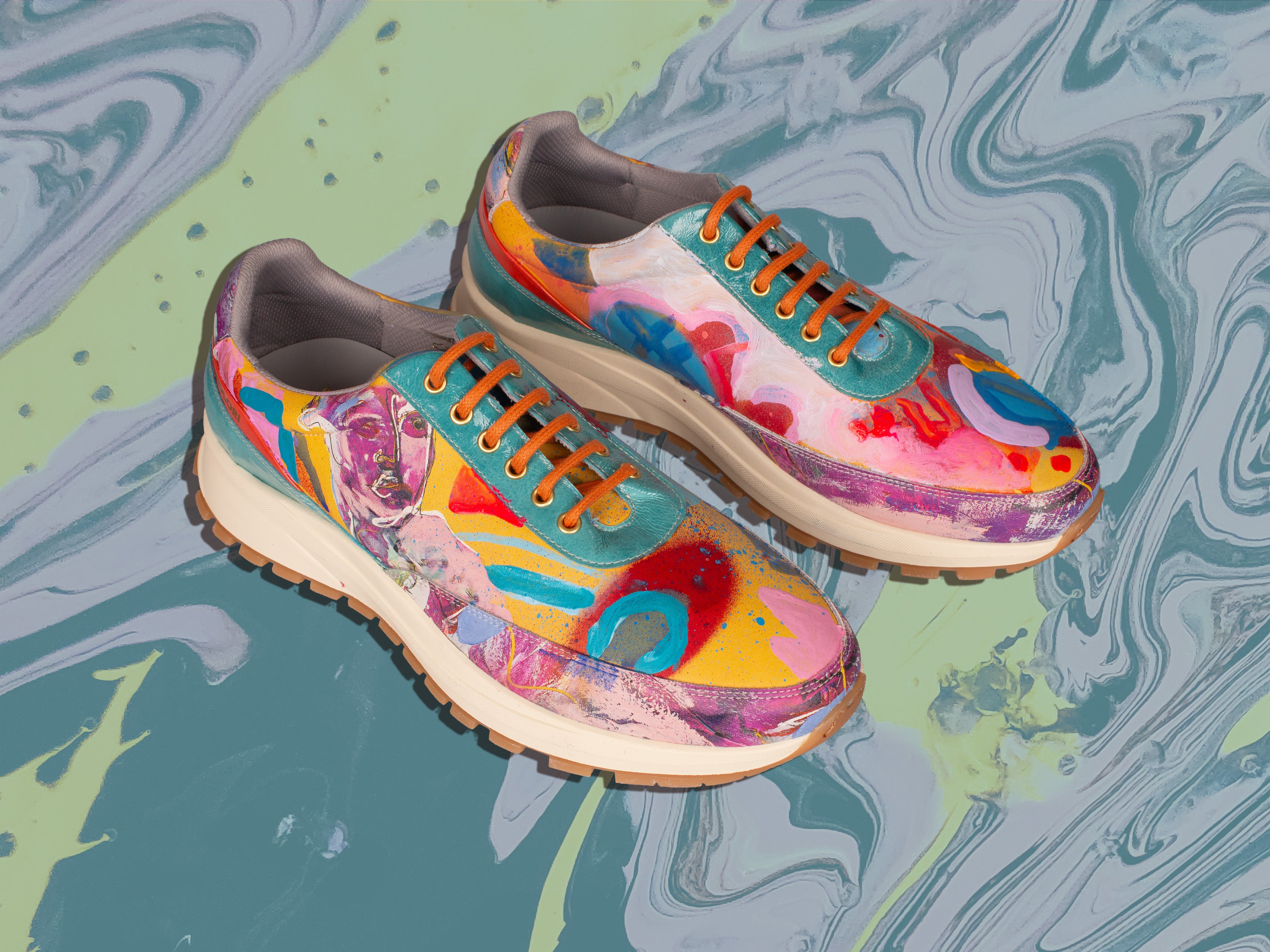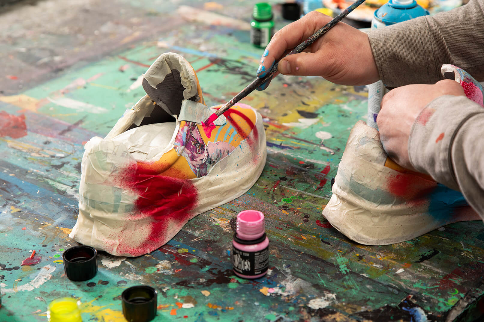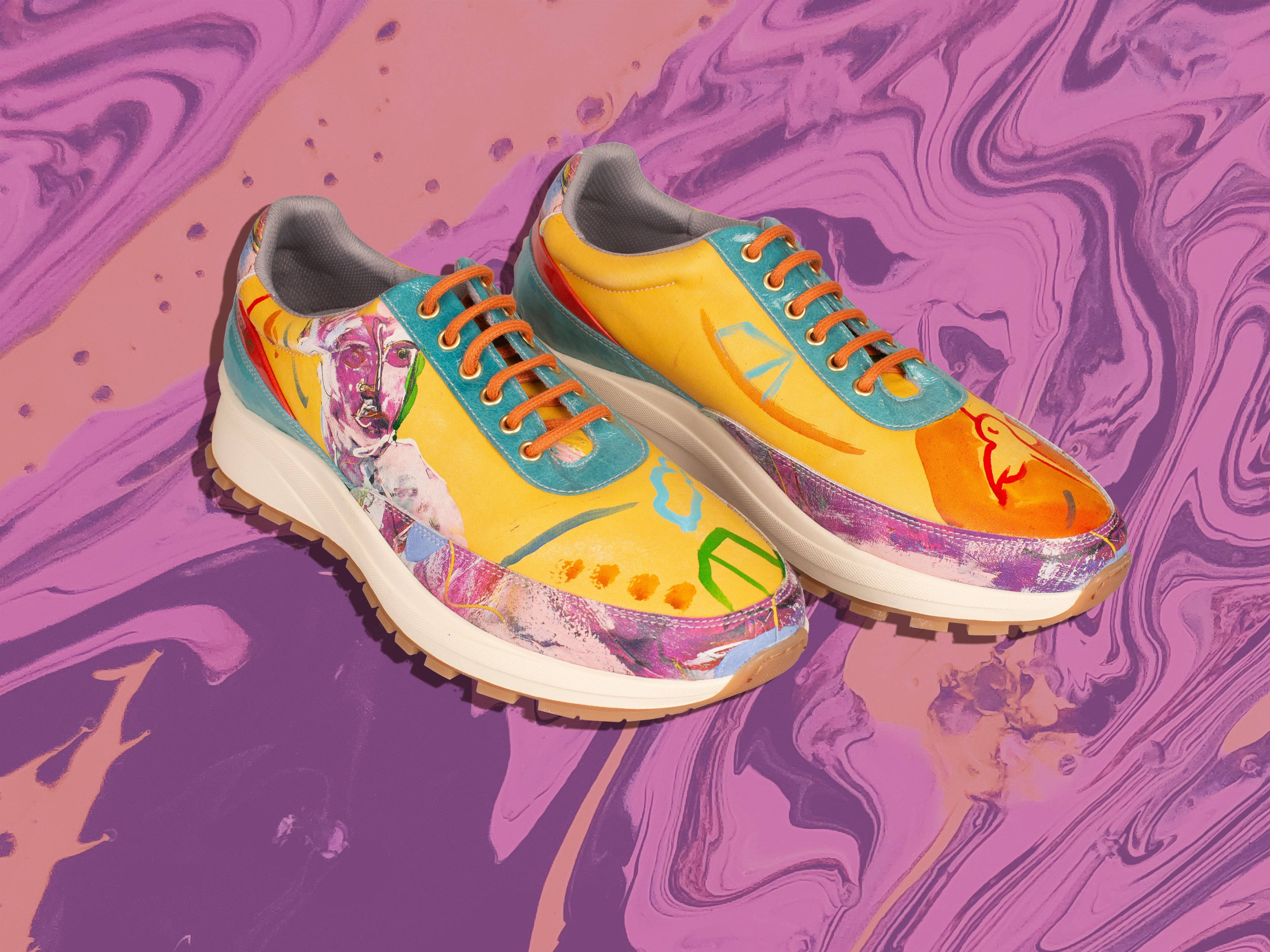 De bovenstaande sneakers zijn geïnspireerd op het kunstwerk: ''Insane in the Brain''. De gebruikte materialen zijn: Acryl, olie & houtskool op linnen - 93 x 65 cm - 2018. De oplage van de schoenen 30 stuks maakt ze extra bijzonder uiteraard.